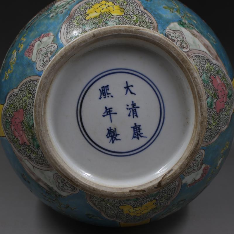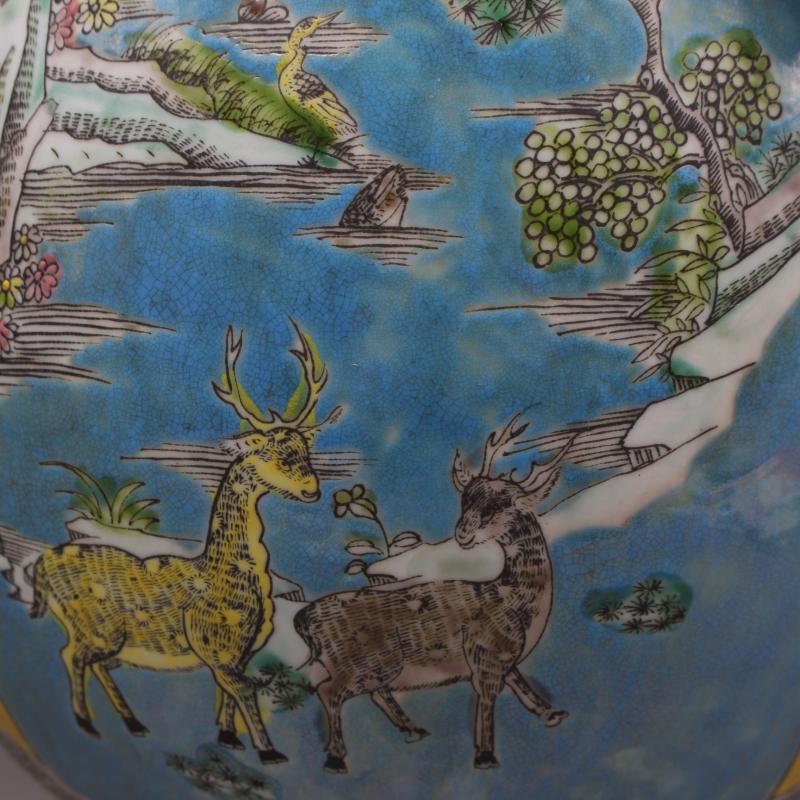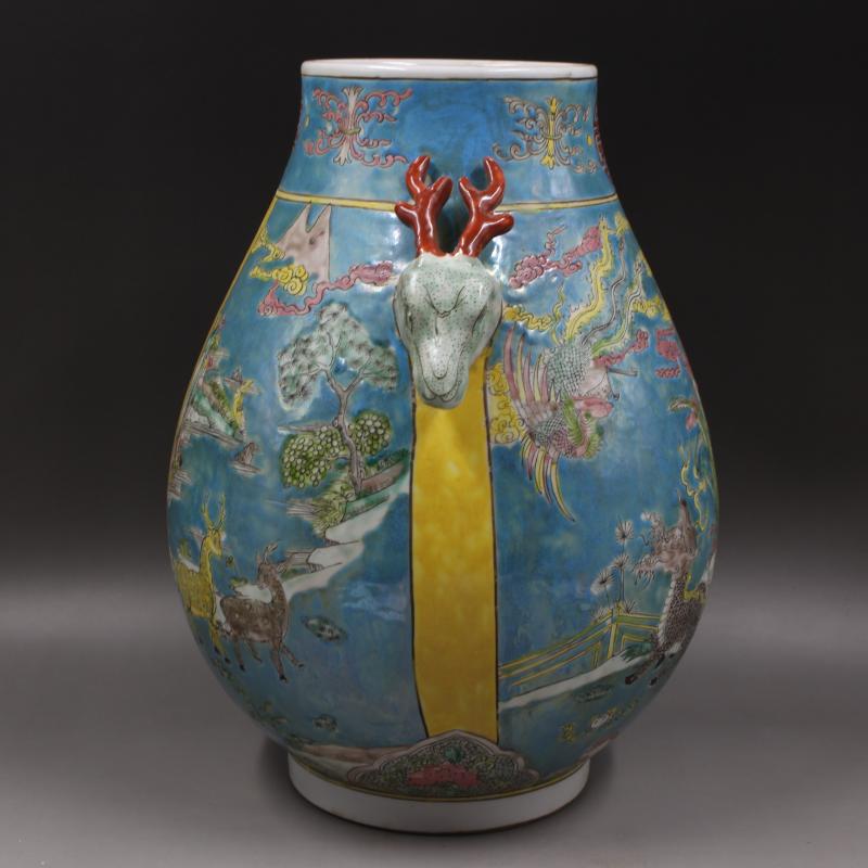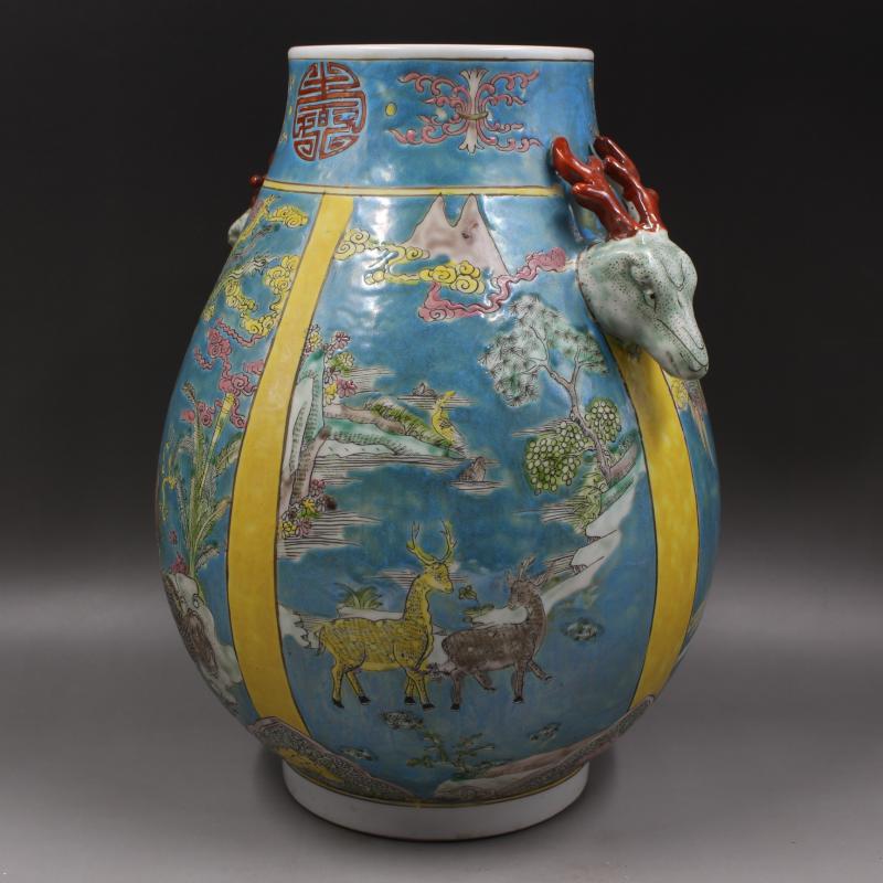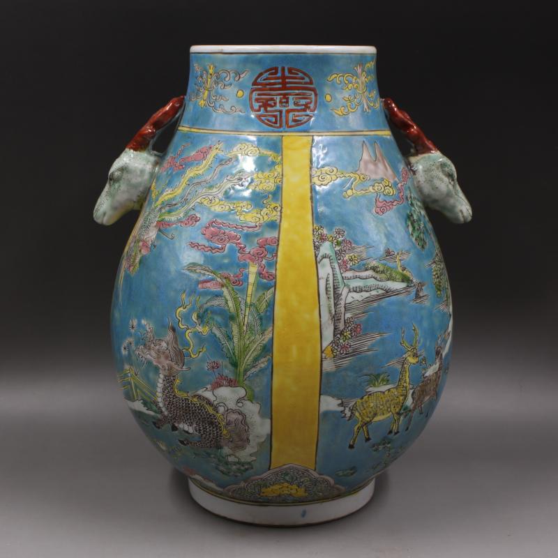 大清康熙年制粉彩福祿壽紋福筒鹿頭尊仿古老貨瓷器擺件古董古玩1入