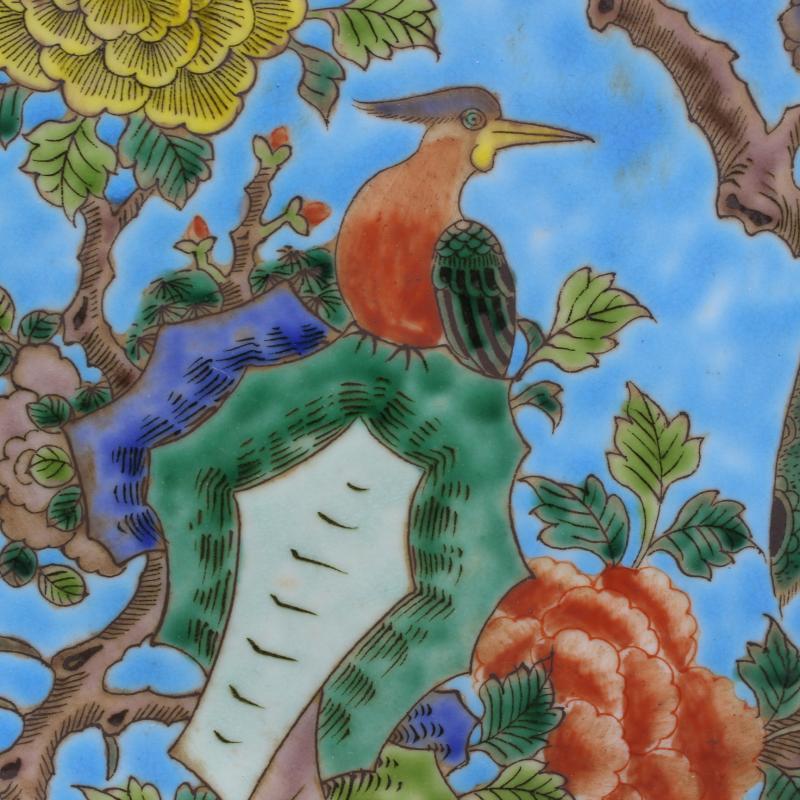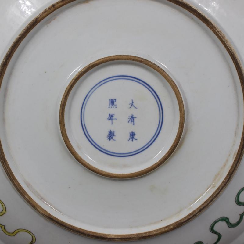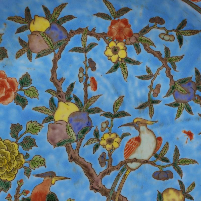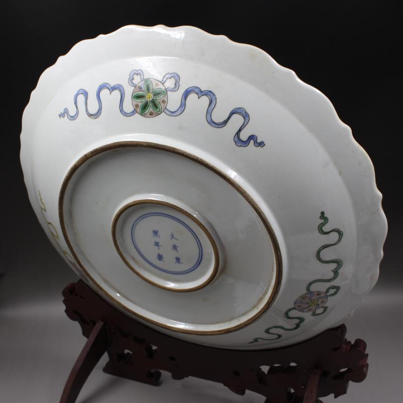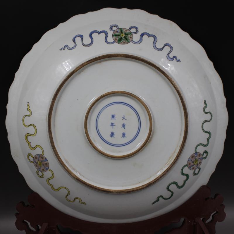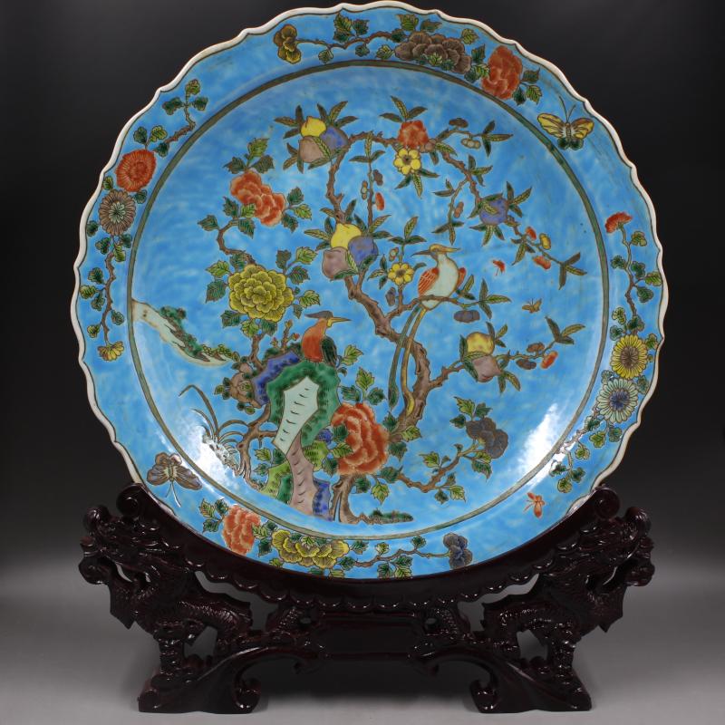 大清康熙年制藍地粉彩花鳥葵口大盤仿古瓷器擺件瓷器古董古玩收藏1入