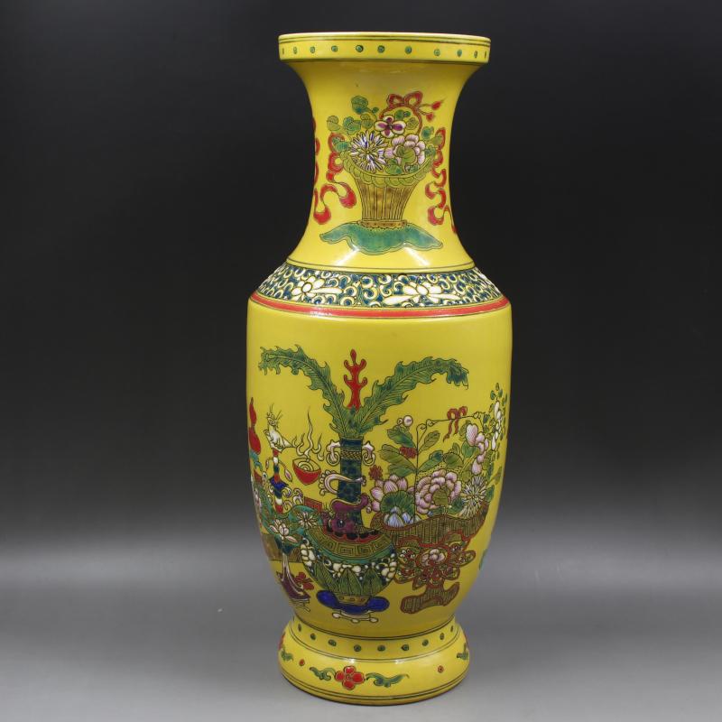 清康熙年制黃地粉彩博古紋賞瓶仿古家居酒店景區瓷器擺件古玩收藏1入