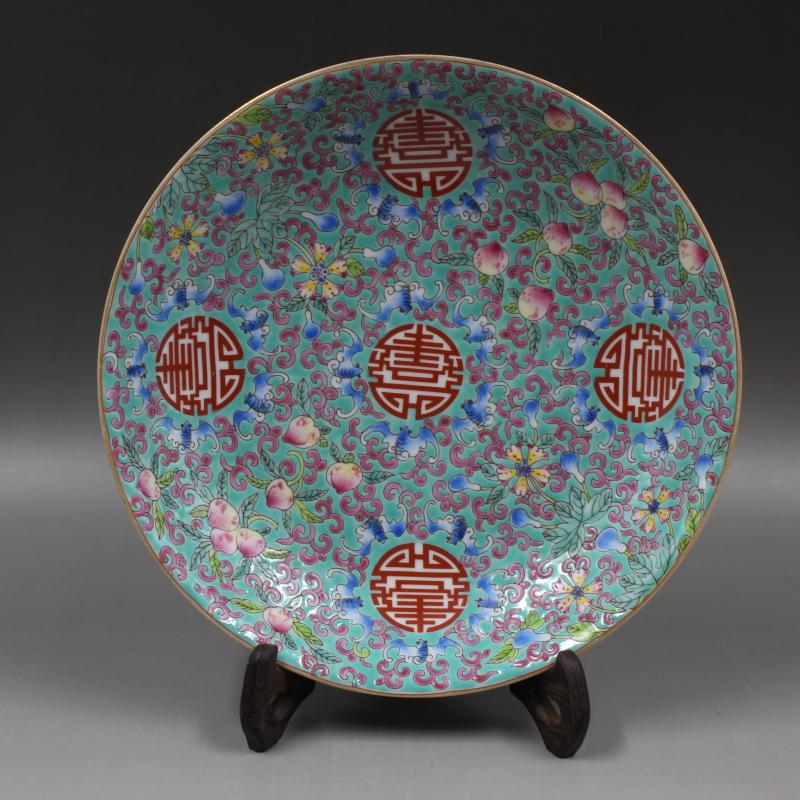 大清雍正年制綠地粉彩壽桃紋盤手繪仿古瓷器家居擺件古董古玩收藏1入