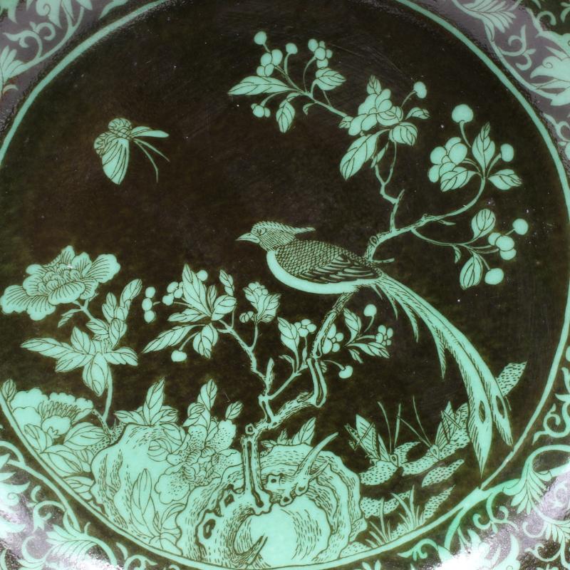 清乾隆年制黑地粉彩花鳥盤手繪家居擺件老貨仿古瓷器古董古玩收藏1入