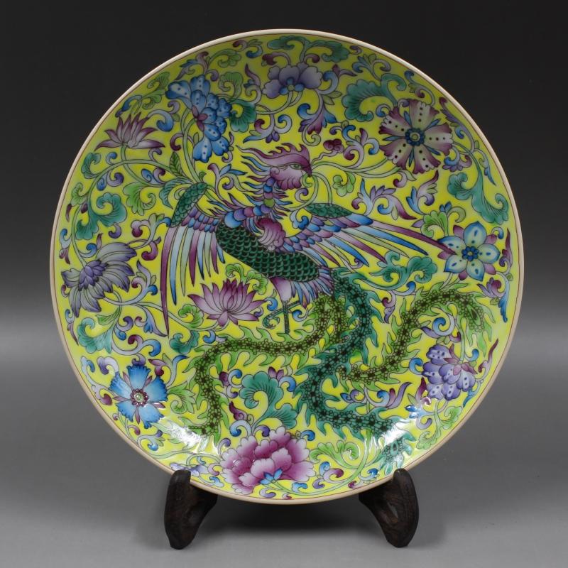 清雍正年制黃地粉彩穿花鳳紋盤家居擺件老貨仿古瓷器古董古玩收藏1入