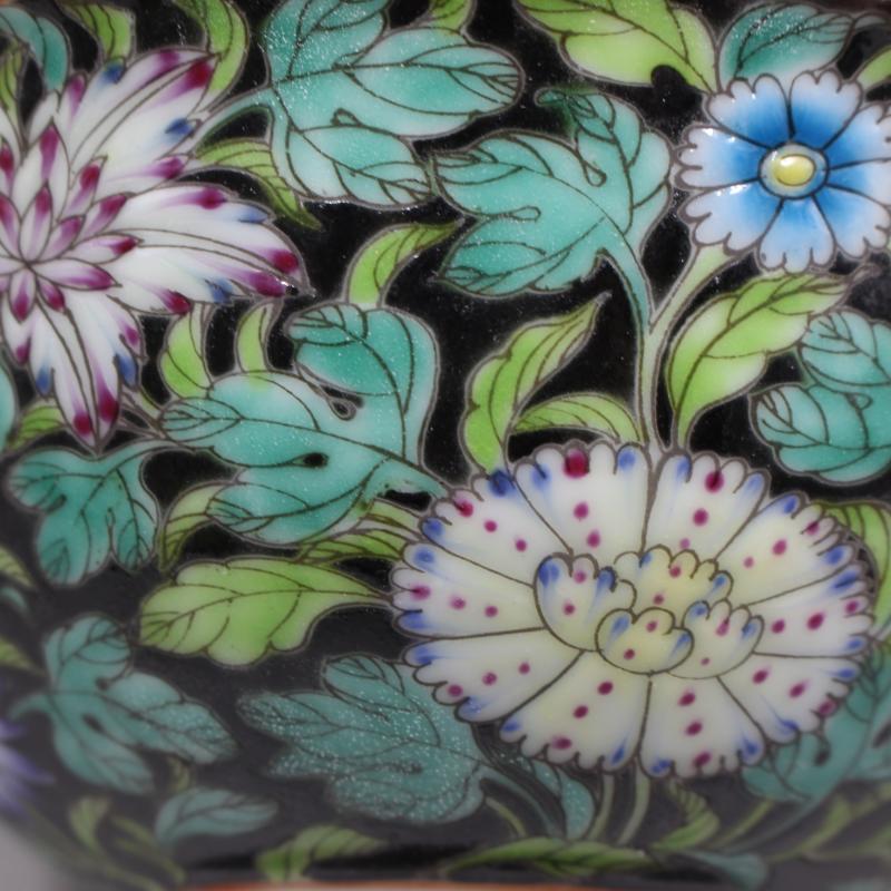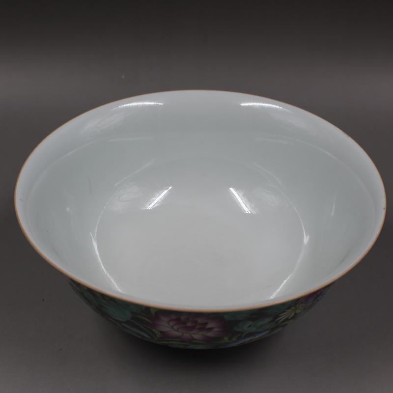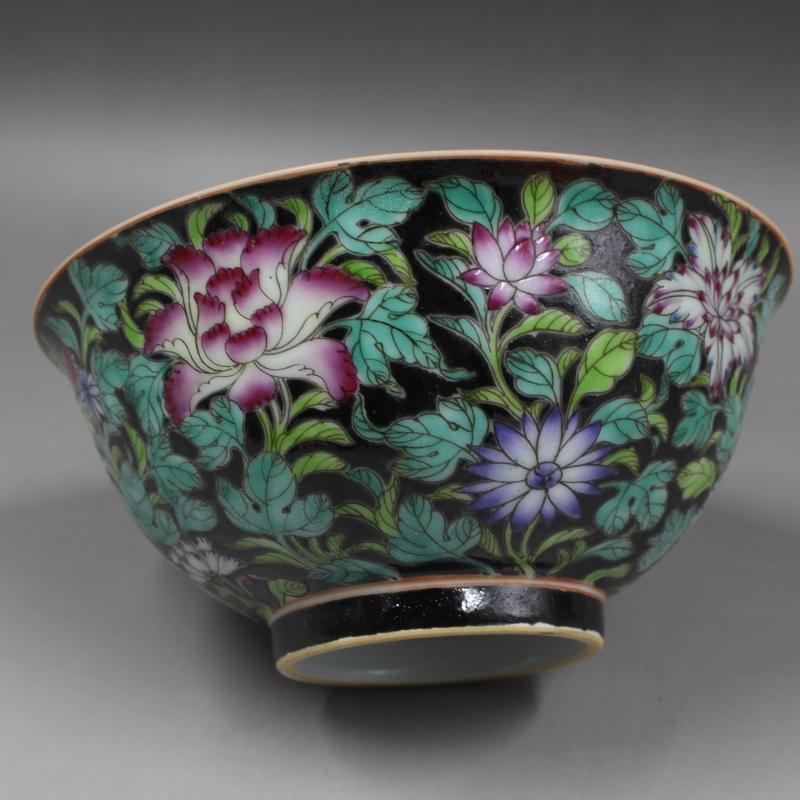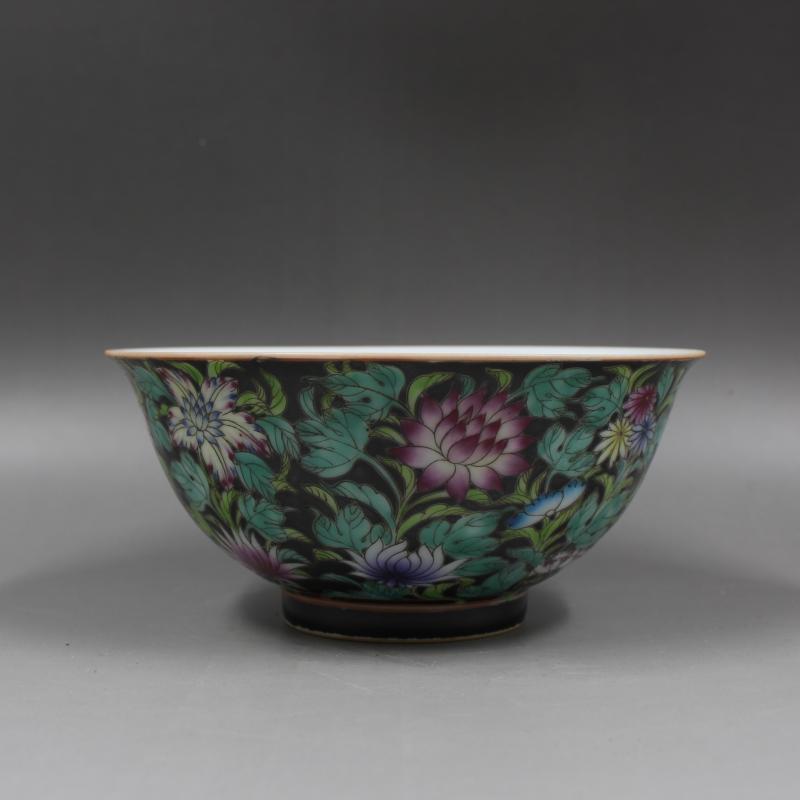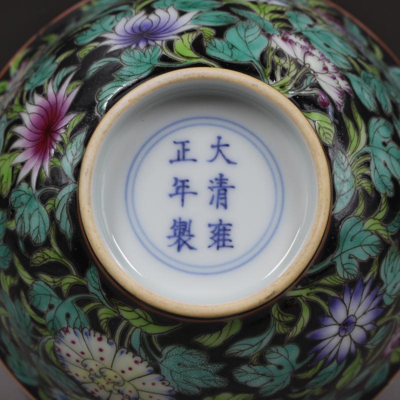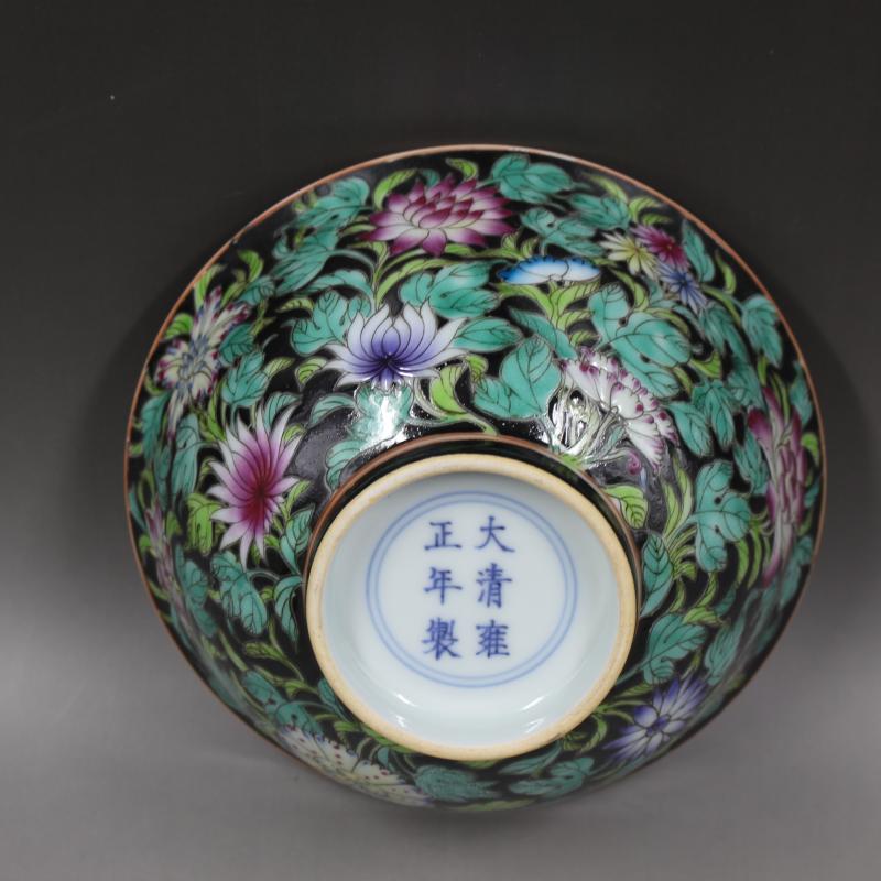 大清雍正年制黑地粉彩花紋碗精品手繪滿工高仿古瓷器擺件古董古玩1入