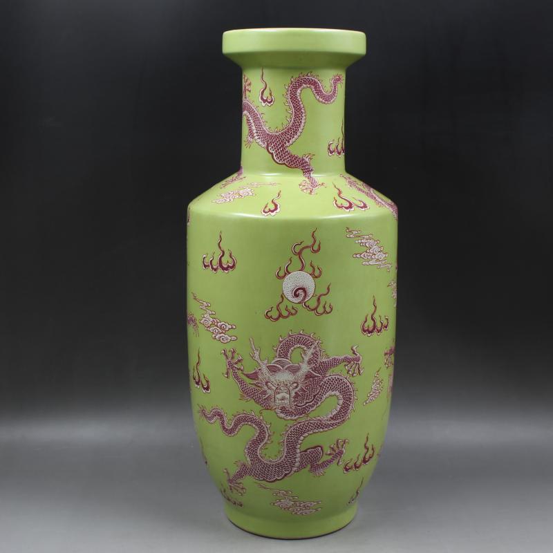 大清康熙年制無光綠釉粉彩云龍紋棒槌瓶仿古瓷器家居擺件古董古玩1入