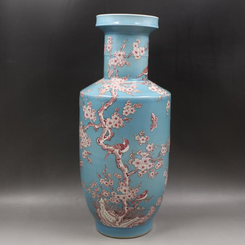 大清康熙年制無光藍釉粉彩喜上眉梢棒槌瓶仿古瓷器擺件古董古玩1入
