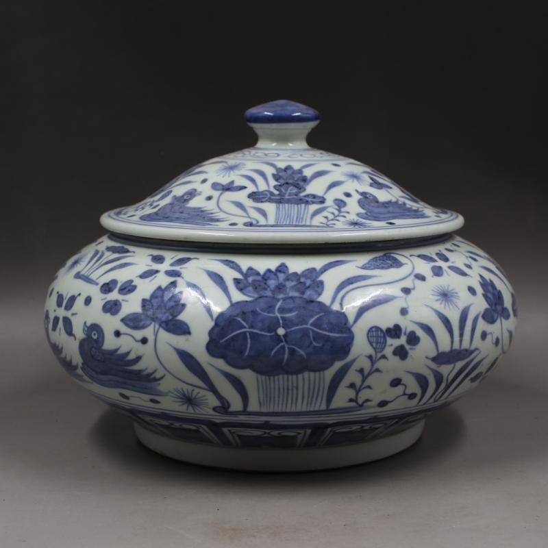 大明永樂年制青花荷花鴛鴦紋蓋罐手繪家居擺件裝飾瓷器古董古玩1入