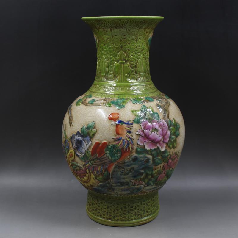 清乾隆年制浮雕粉彩花鳥花觚瓶仿古老貨瓷器家居擺件古董古玩1入
