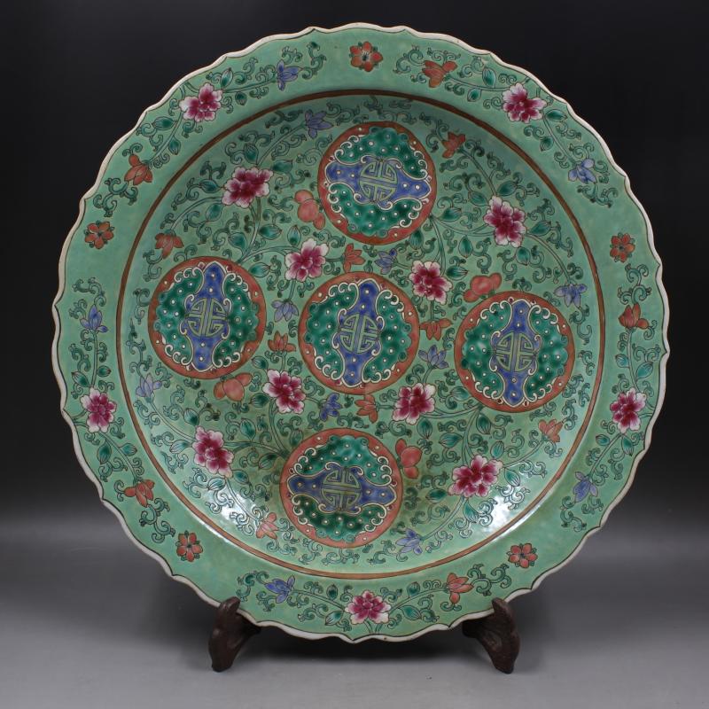 大清咸豐年制綠地粉彩纏枝福壽大盤仿古老貨瓷器家居擺件古董古玩1入