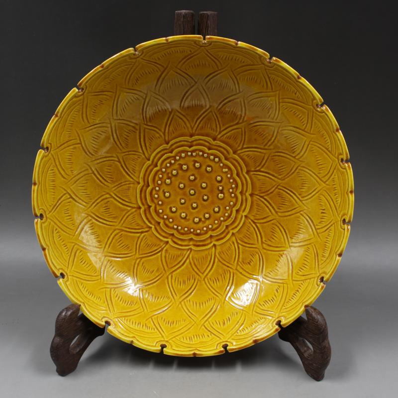 明弘治黃釉刻蓮瓣盤 仿古出土做舊瓷器古董古玩全手工收藏擺件1入