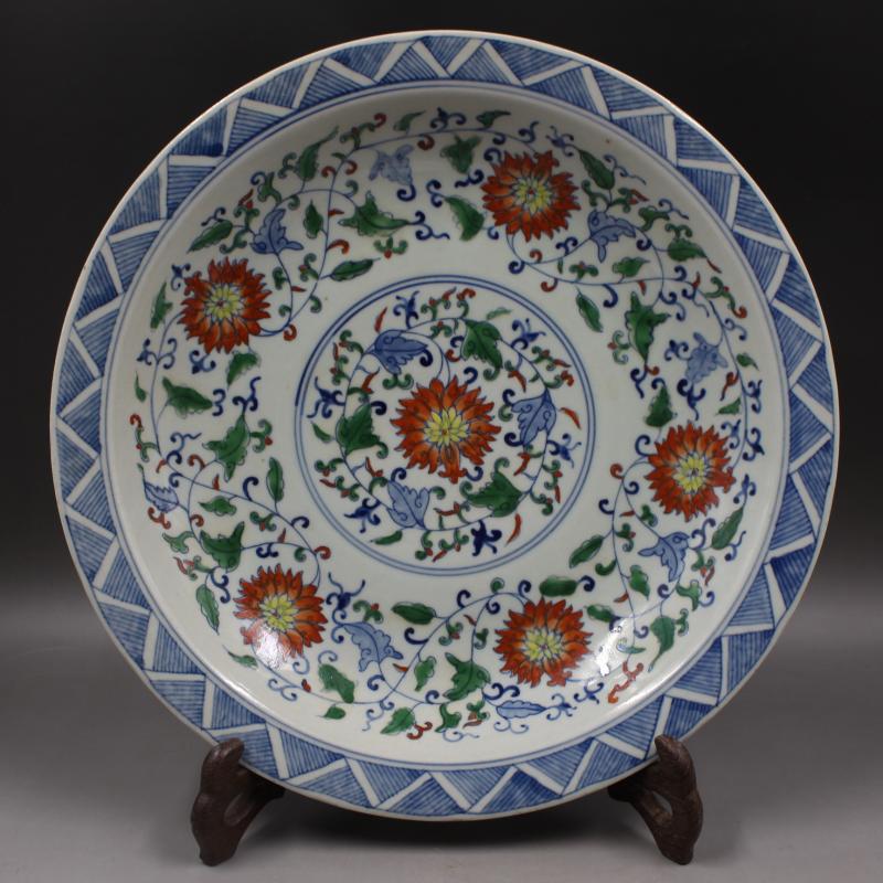 大明萬歷年制青花斗彩穿枝蓮紋盤手繪仿古老貨瓷器家居古玩擺件1入