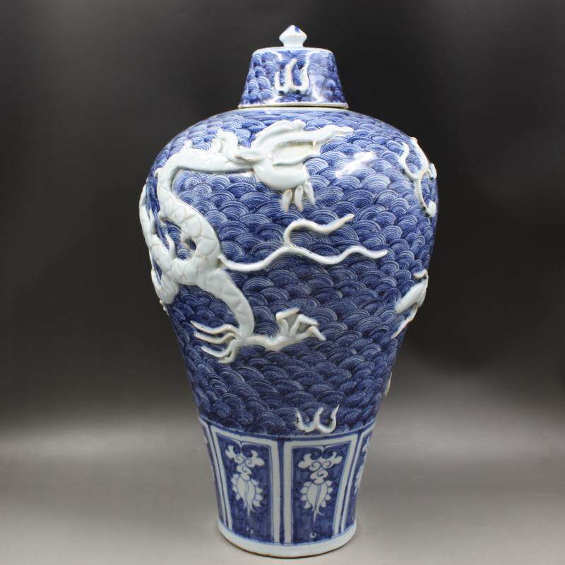 手繪仿古元青花浮雕海水龍紋梅瓶仿古老貨瓷器家居擺件古董古玩1入