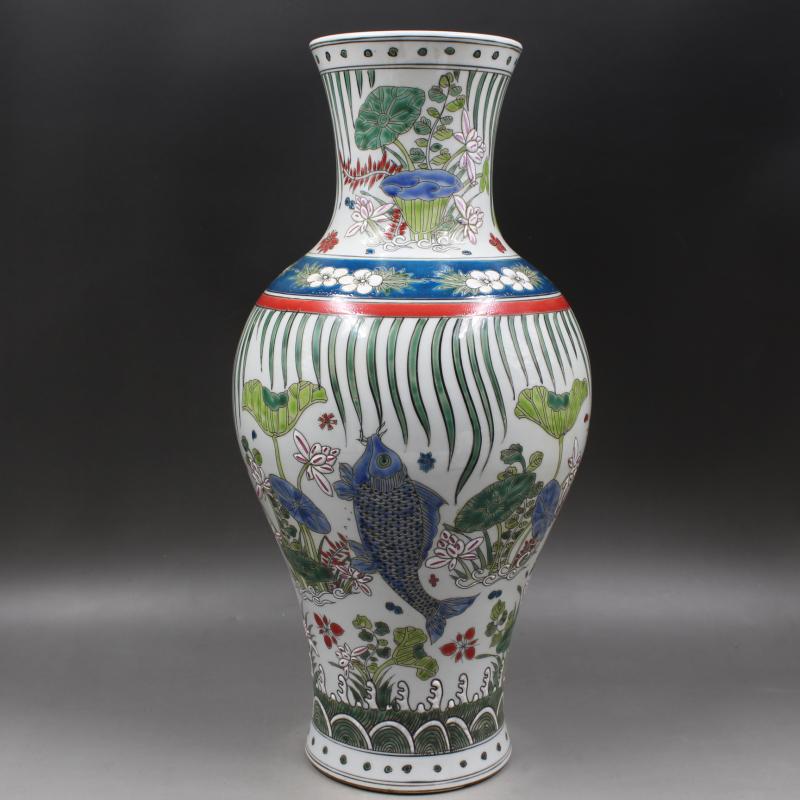 大清康熙年制五彩荷花魚澡紋觀音瓶家居仿古瓷器擺件古董古玩收藏1入