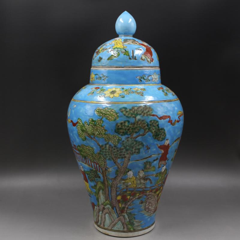 大清康熙年制藍地粉彩人物蓋罐仿古家居復古瓷器擺件古董古玩收藏1入