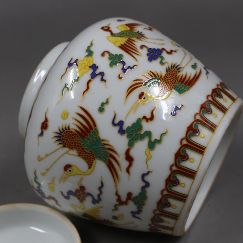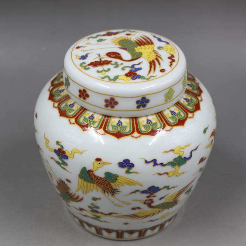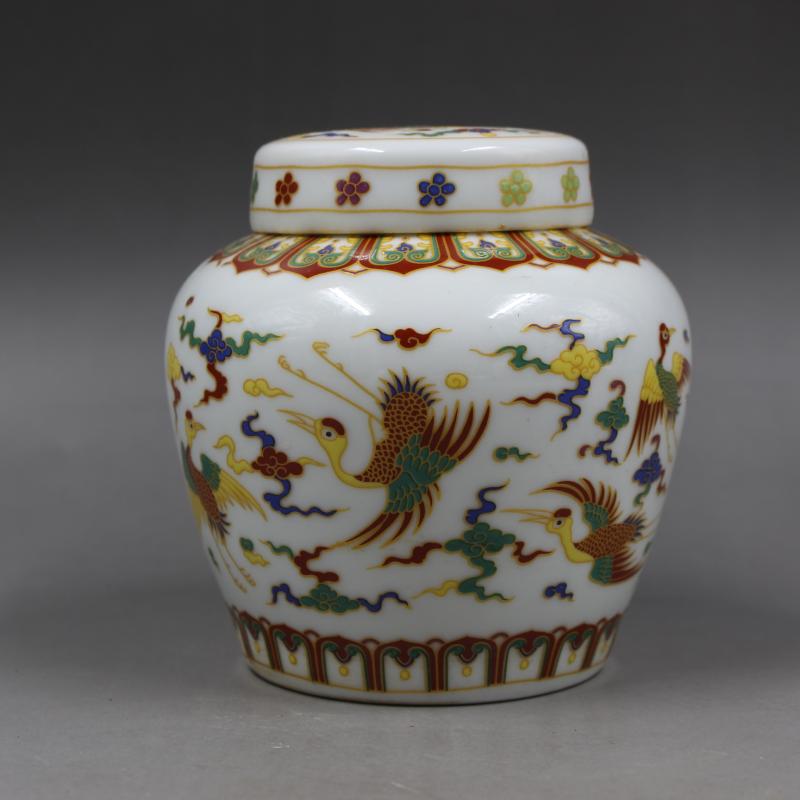 大明成化年制五彩鶴紋天子罐仿古老貨瓷器家居擺件古董古玩收藏1入
