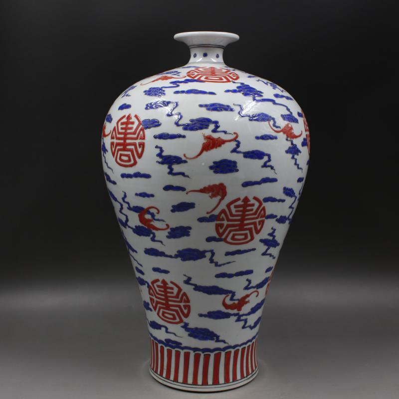 大清康熙年制青花斗彩福壽紋梅瓶家居老貨擺件仿古瓷器古董古玩1入