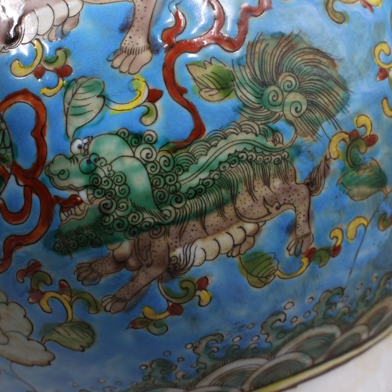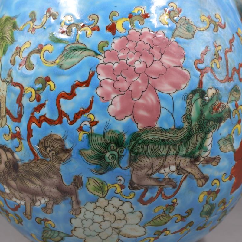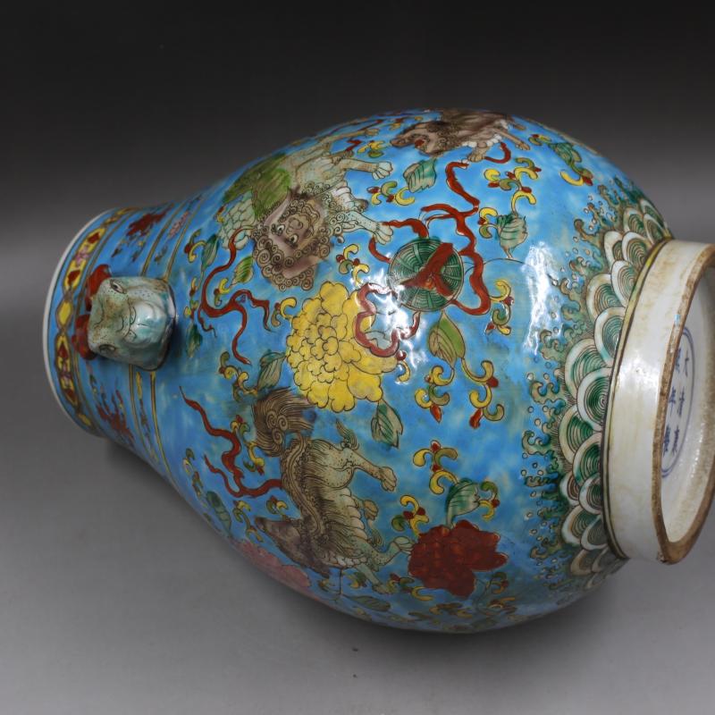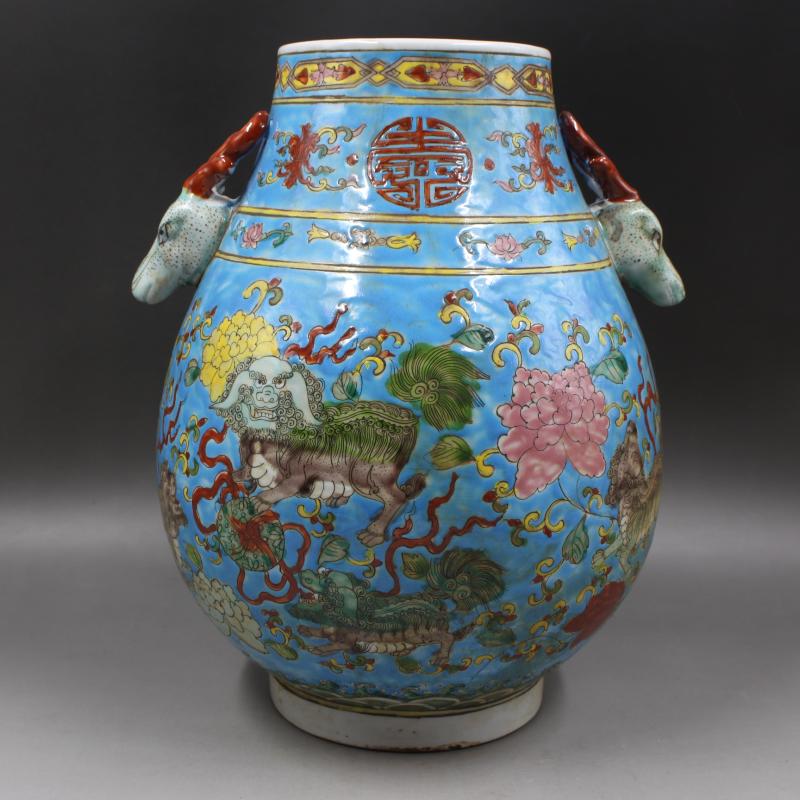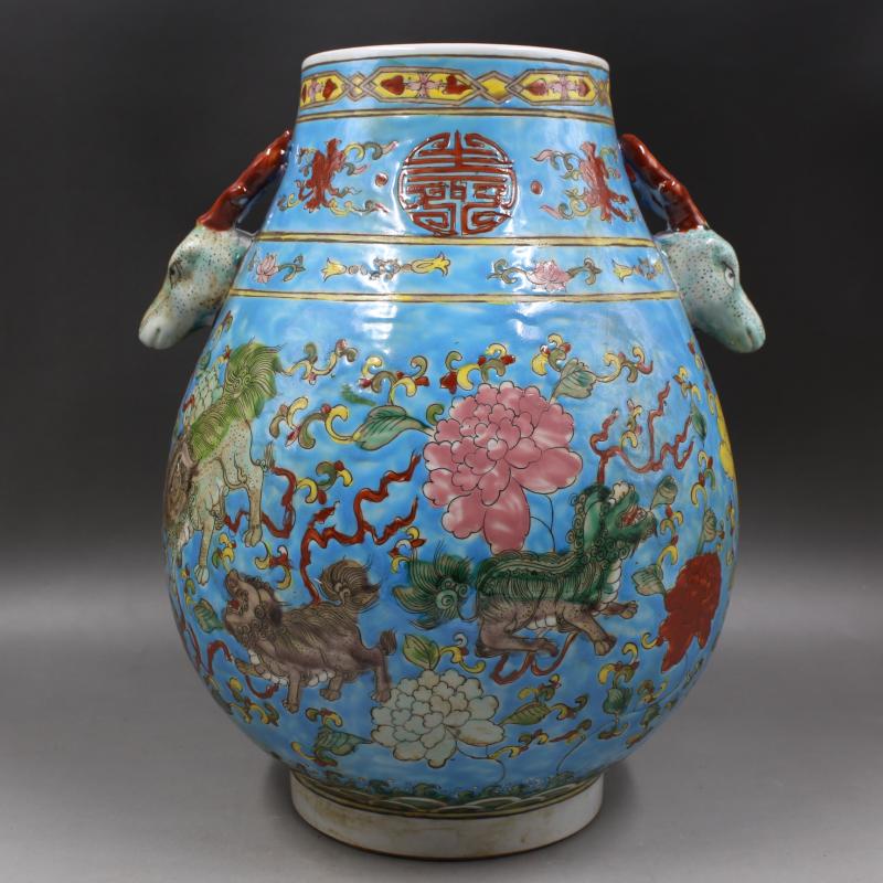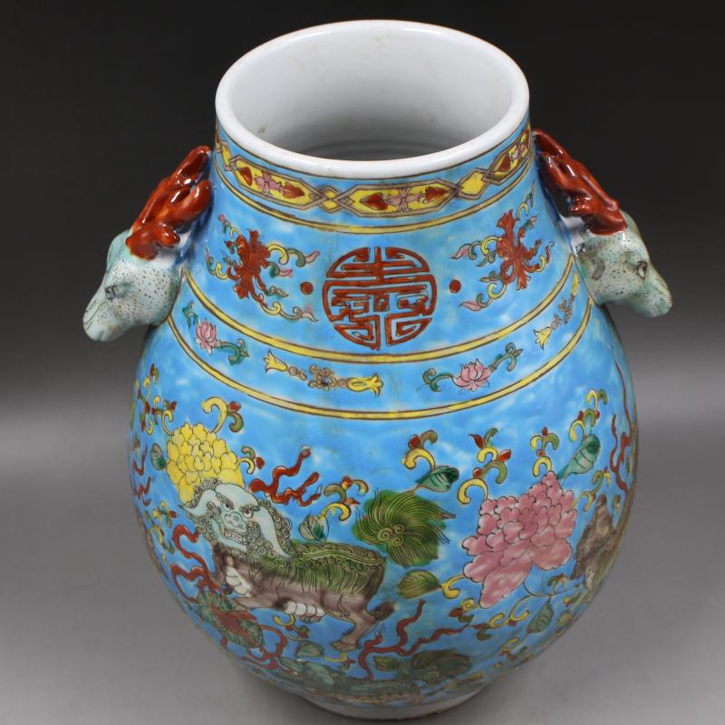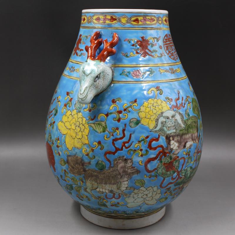 大清康熙年制藍地粉彩獅紋鹿頭尊仿古家居瓷器擺件古董古玩收藏1入