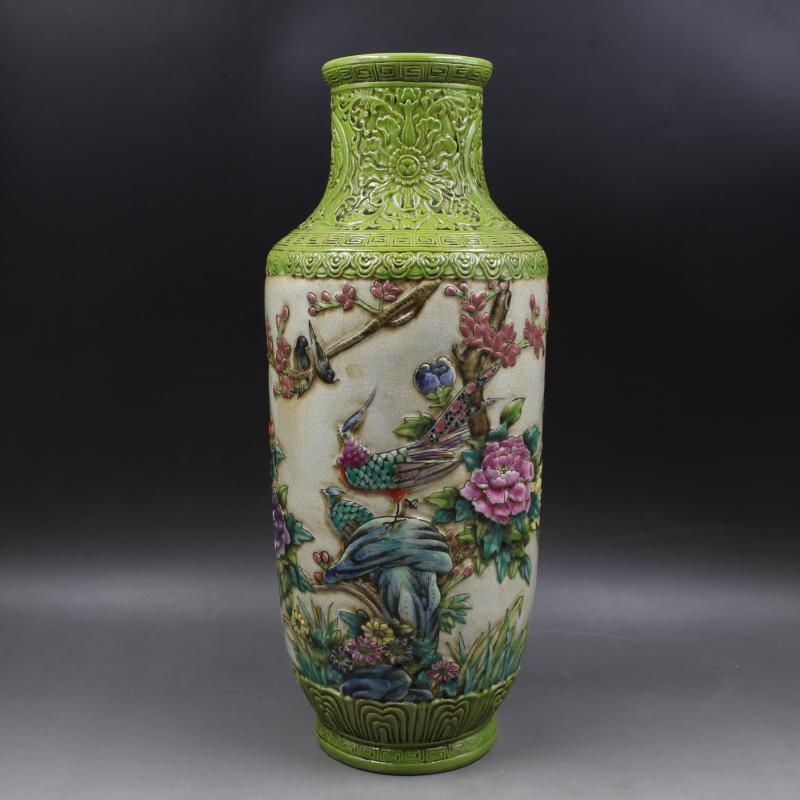 清乾隆年制浮雕粉彩花鳥棒槌瓶 老廠貨仿古瓷器擺件 古董古玩收藏1入