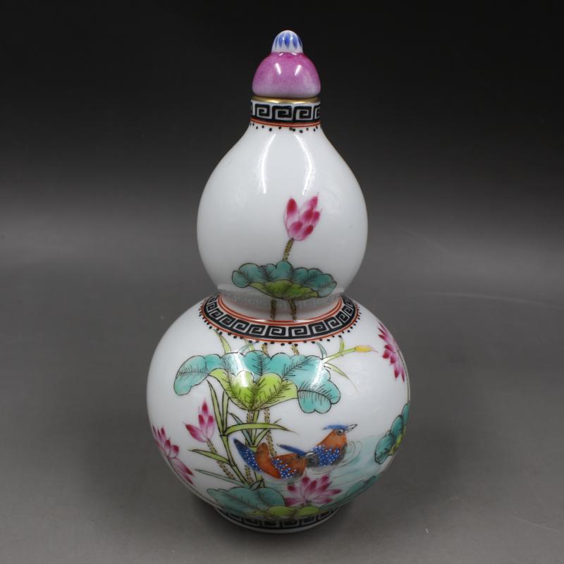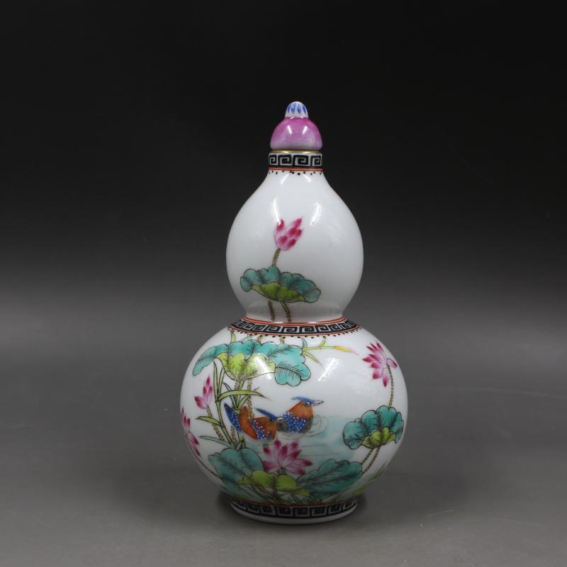 清乾隆年制粉彩荷花花鳥葫蘆瓶 手繪仿古瓷器 家居擺件 古董古玩1入