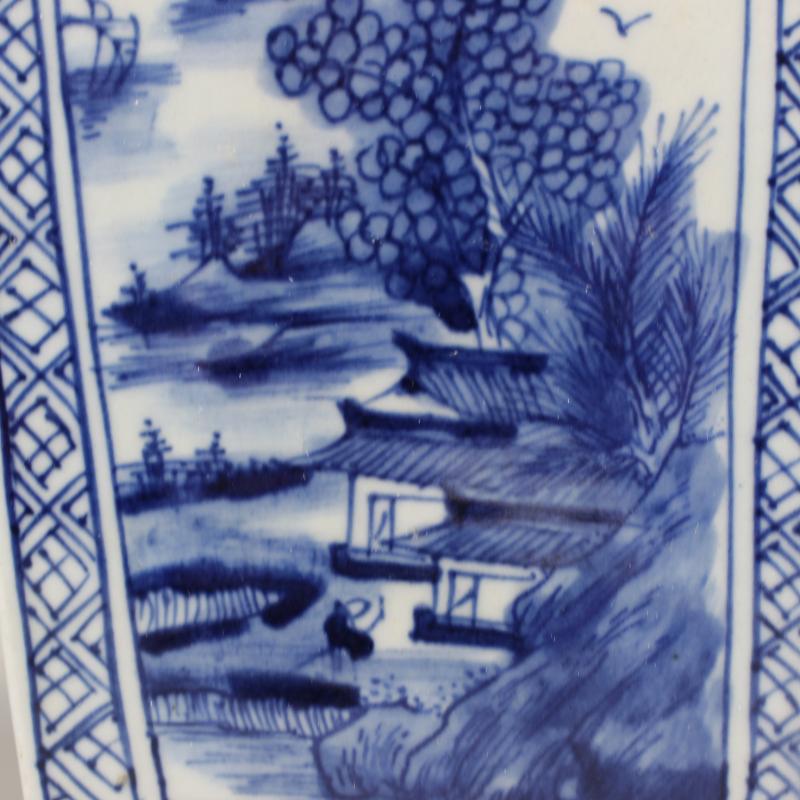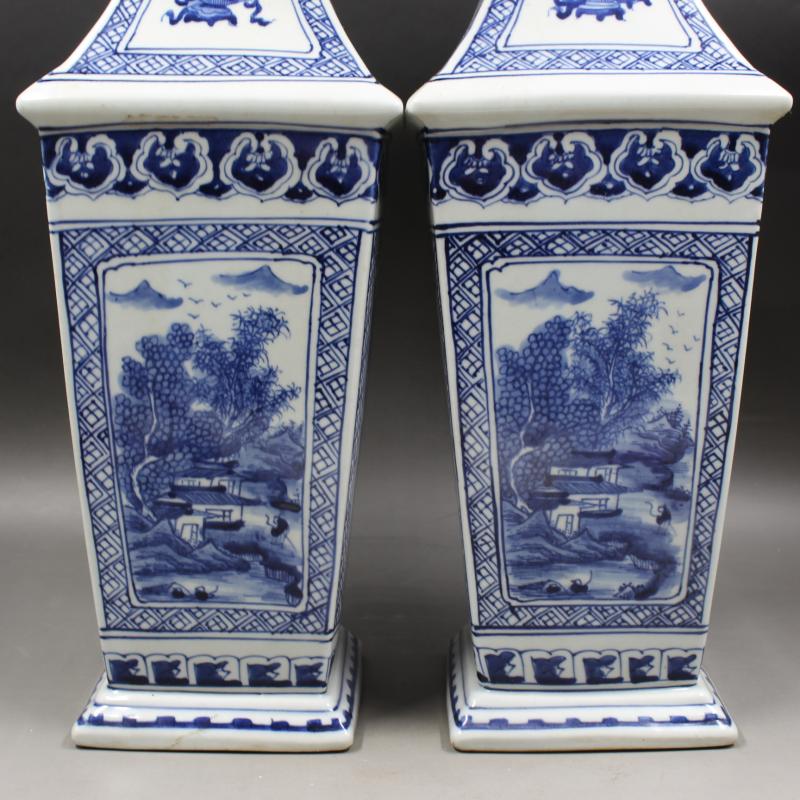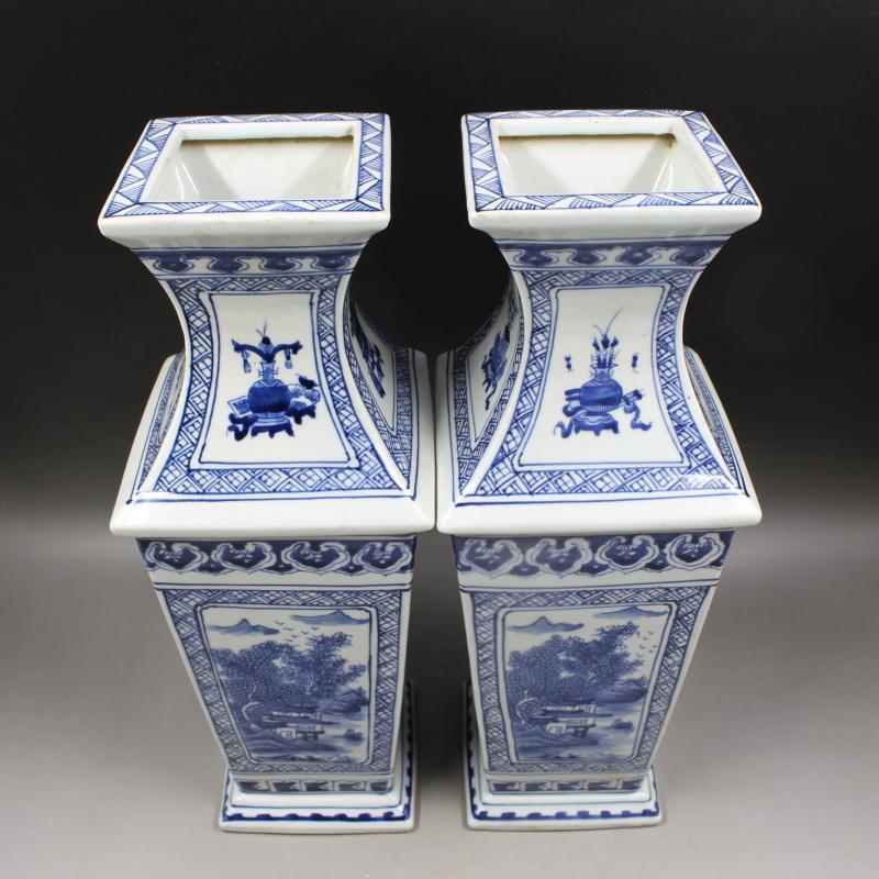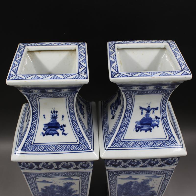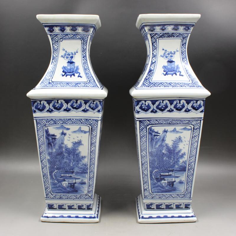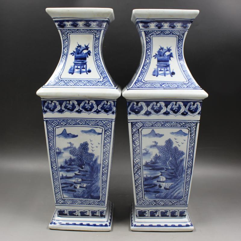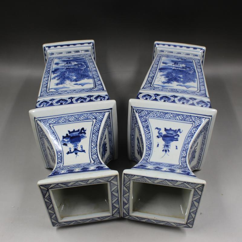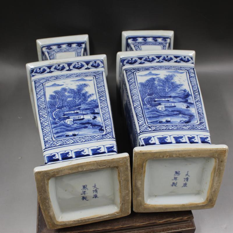 清康熙年制青花人物山水四方花瓶 手工仿古老貨瓷器 家居古董擺件1入