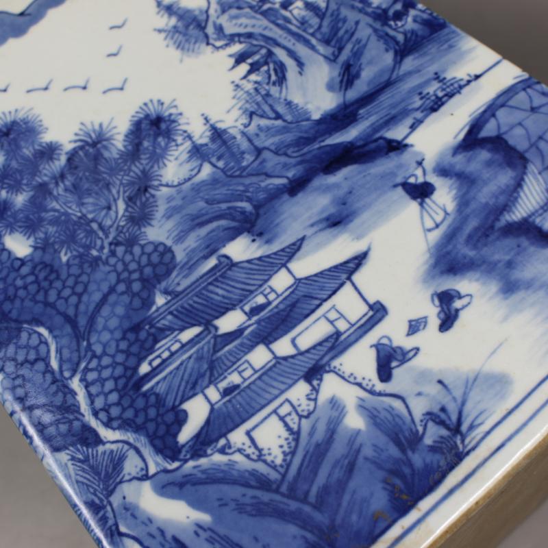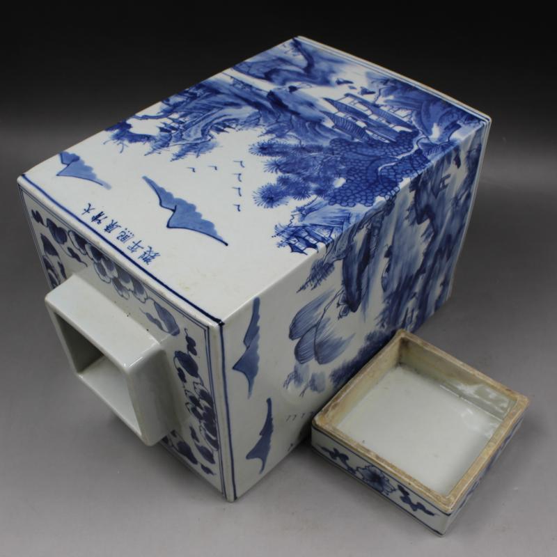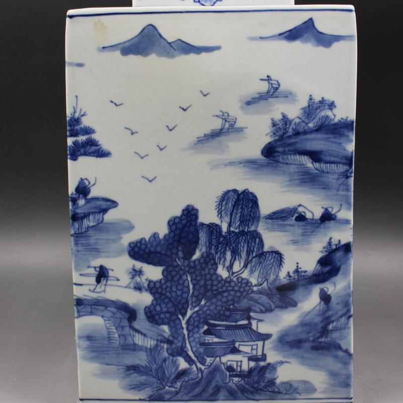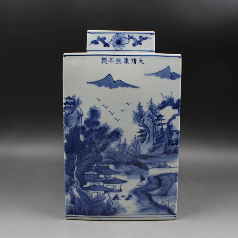 清康熙年制青花人物山水四方茶葉罐 手繪仿古老貨瓷器古玩擺件1入