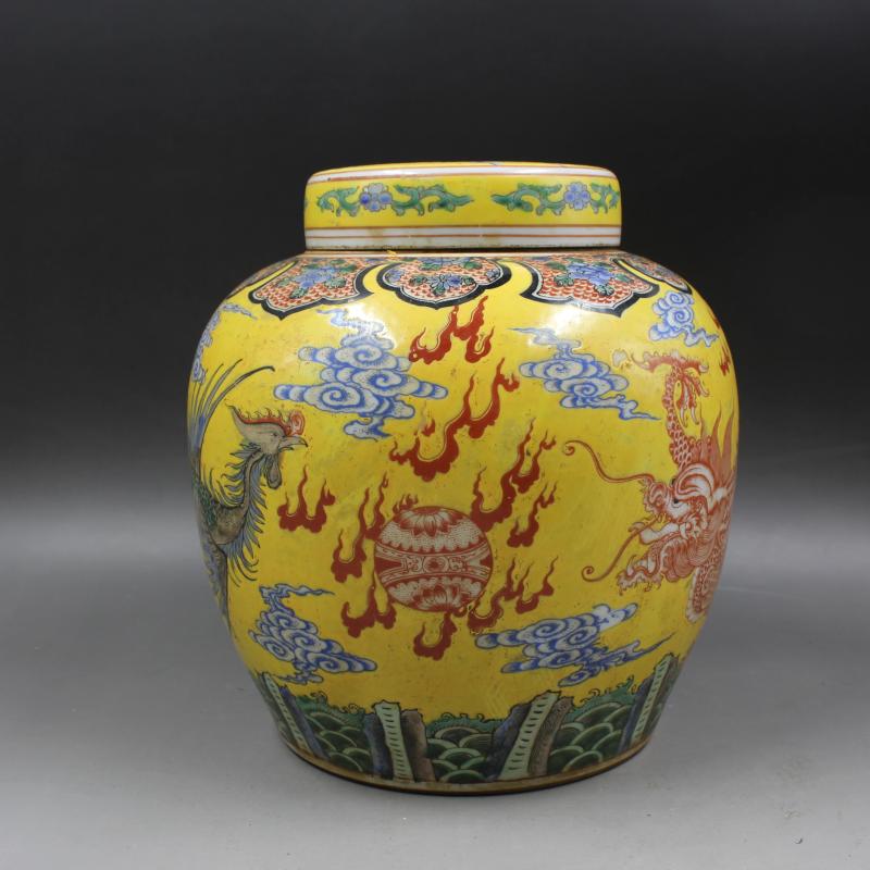 清康熙年制黃地粉彩龍鳳紋罐 仿古老貨瓷器 家居擺件古董古玩收藏1入