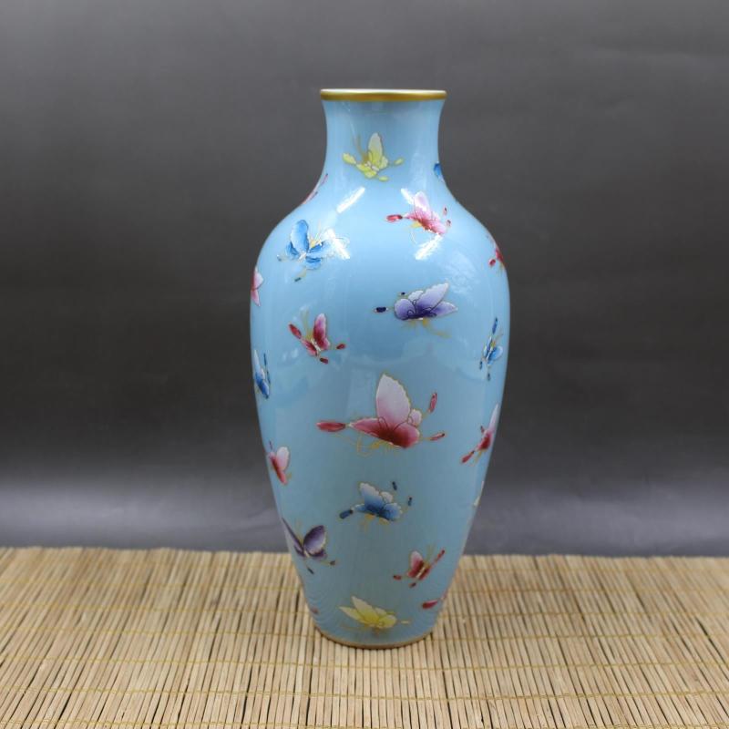 清乾隆年制豆青釉粉彩蝴蝶觀音瓶 手繪仿古工藝瓷器擺件 古玩收藏1入