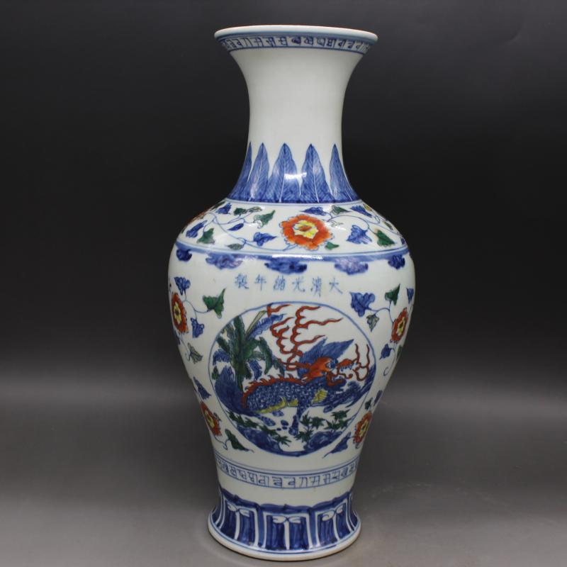 清光緒年制青花斗彩纏枝麒麟魚尾瓶 全手工仿古瓷器 家居裝飾擺件1入