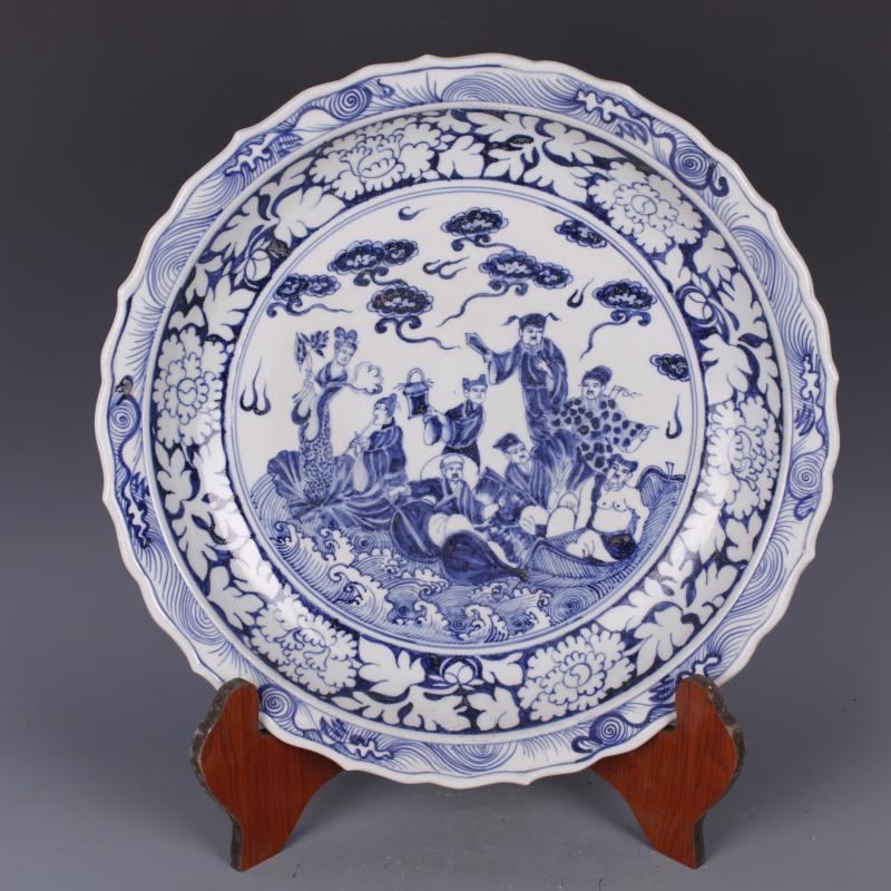 元青花八仙人物葵口大盤全手工仿古老貨瓷器家居擺件古董古玩收藏1入