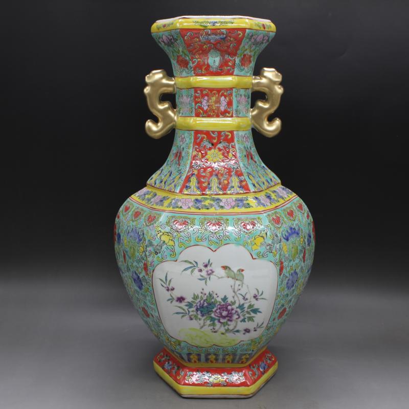 大清乾隆年制粉彩描金福壽六方賞瓶 仿古老貨瓷器擺件 古董收藏1入