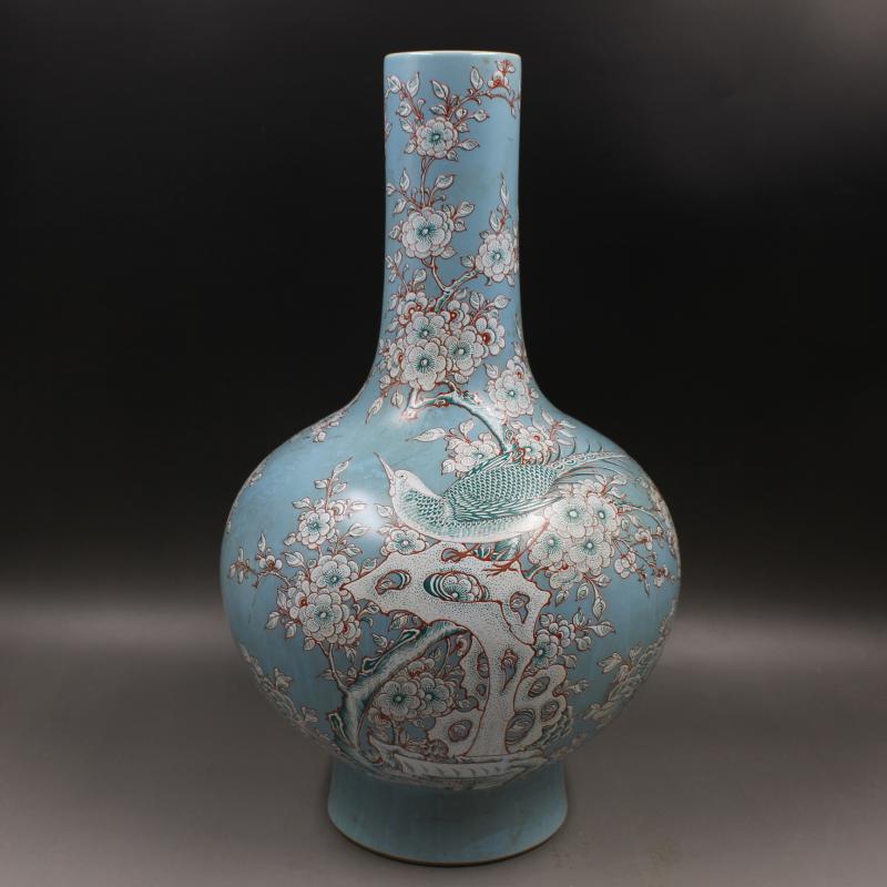 大清康熙年制無光釉粉彩花鳥天球瓶 仿古瓷器擺件 古董古玩收藏1入