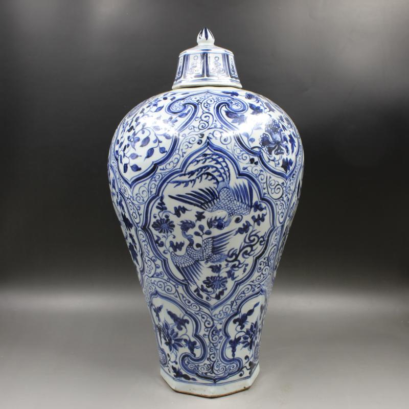 元青花滿工荷花鴛鴦鳳紋八方梅瓶全手繪仿古老貨瓷器擺件古玩收藏1入