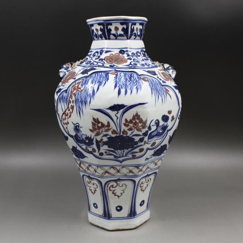 元青花釉里紅荷花鴛鴦紋虎頭罐 全手工仿古出土瓷器擺件 古玩收藏1入