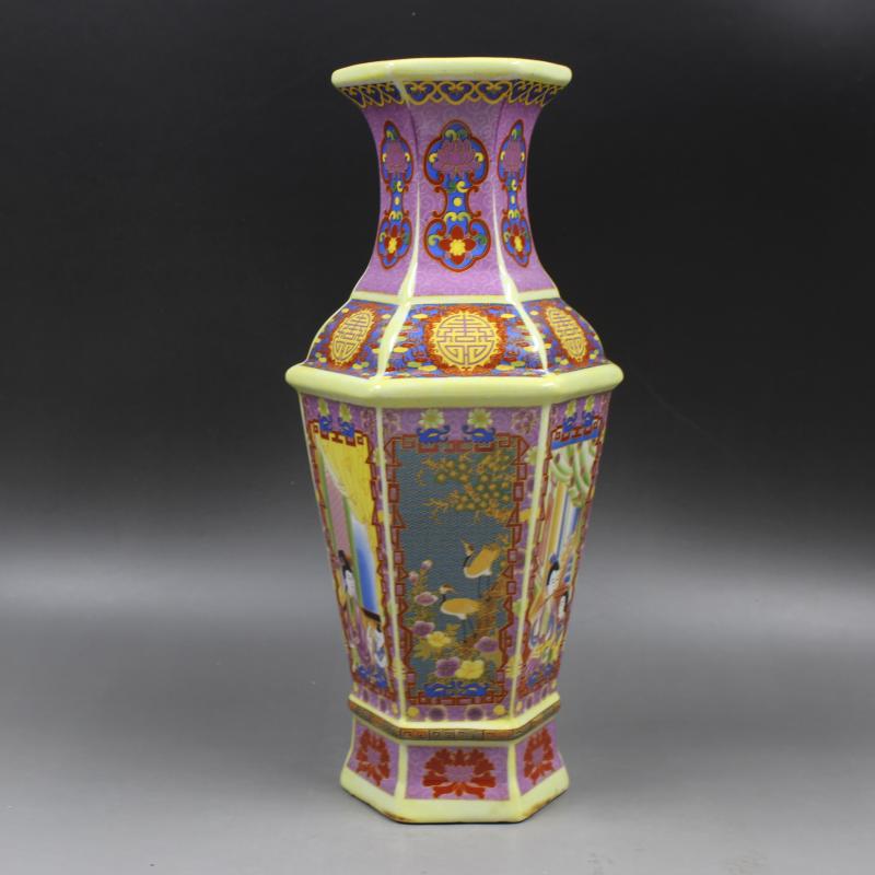清雍正年制爬花琺瑯彩六方人物花鳥魚尾瓶 仿古瓷器擺件 古玩收藏1入