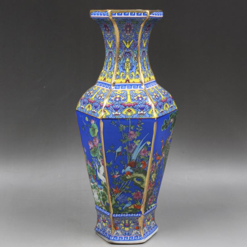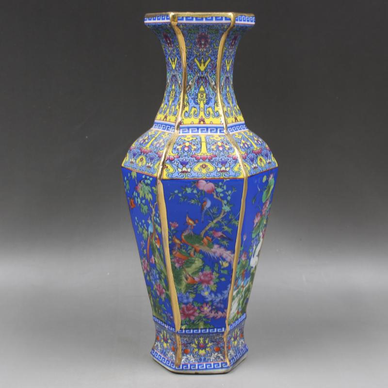 清乾隆年制琺瑯彩描金花鳥六方花瓶家居擺件精品瓷器古董古玩收藏1入