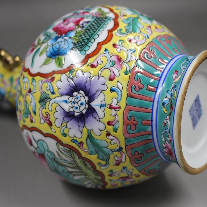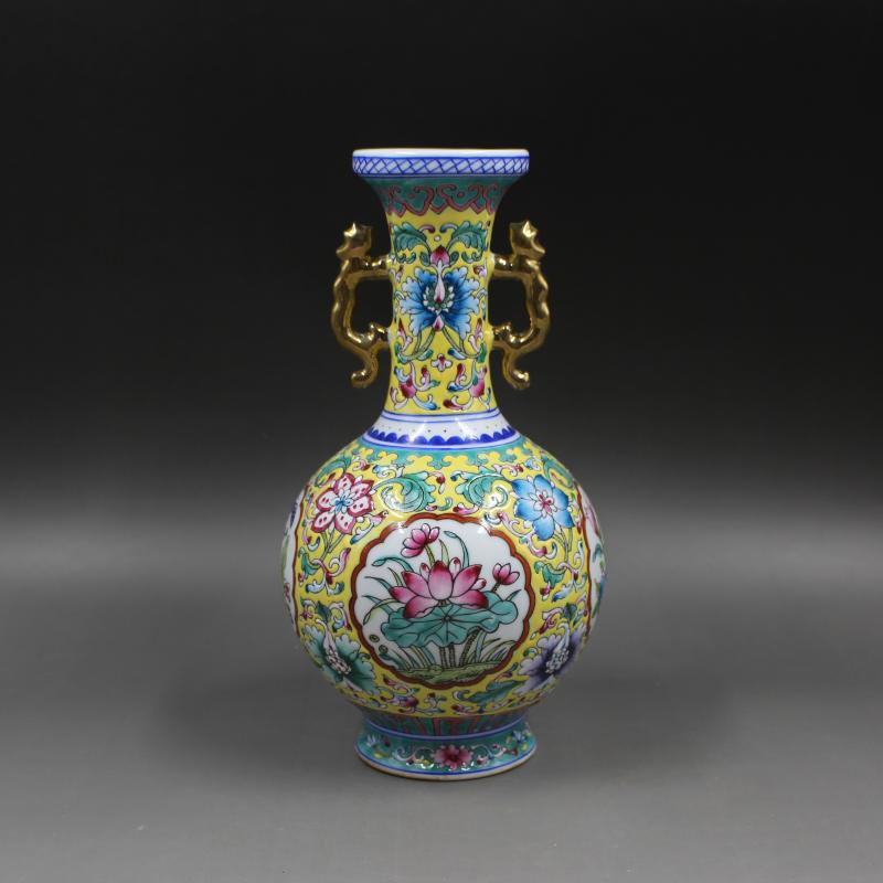 大清乾隆年制黃地粉彩四季花龍耳賞瓶 手工仿古瓷器 家居擺件古玩1入