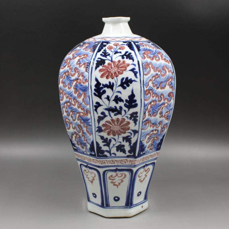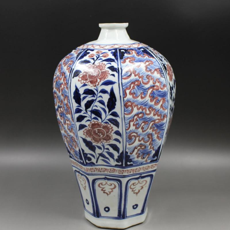 元青花釉里紅滿工海水花紋八方梅瓶仿古出土老貨瓷器擺件古玩收藏1入