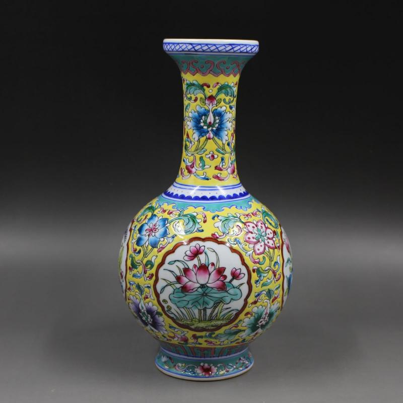 大清乾隆年制黃地粉彩四季花賞瓶 手工仿古瓷器 家居擺件古玩收藏1入