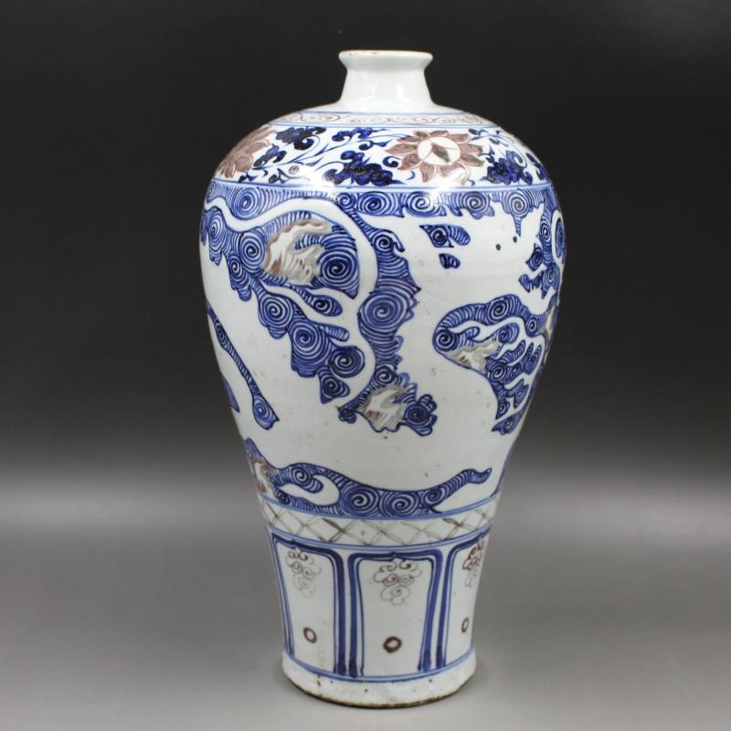 元青花釉里紅刻海水龍紋梅瓶 手工仿古出土老貨瓷器擺件 古玩收藏1入