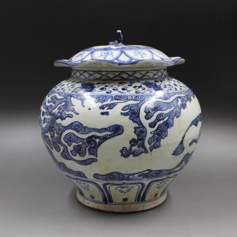 元青花青花刻玻璃白龍紋蓋罐 手繪仿古出土老貨瓷器擺件 古玩收藏1入