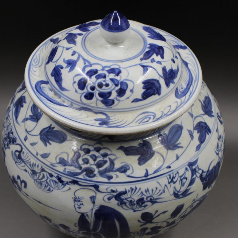 元青花人物鬼谷子下山蓋罐 全手工仿古出土老貨瓷器擺件 古玩收藏1入