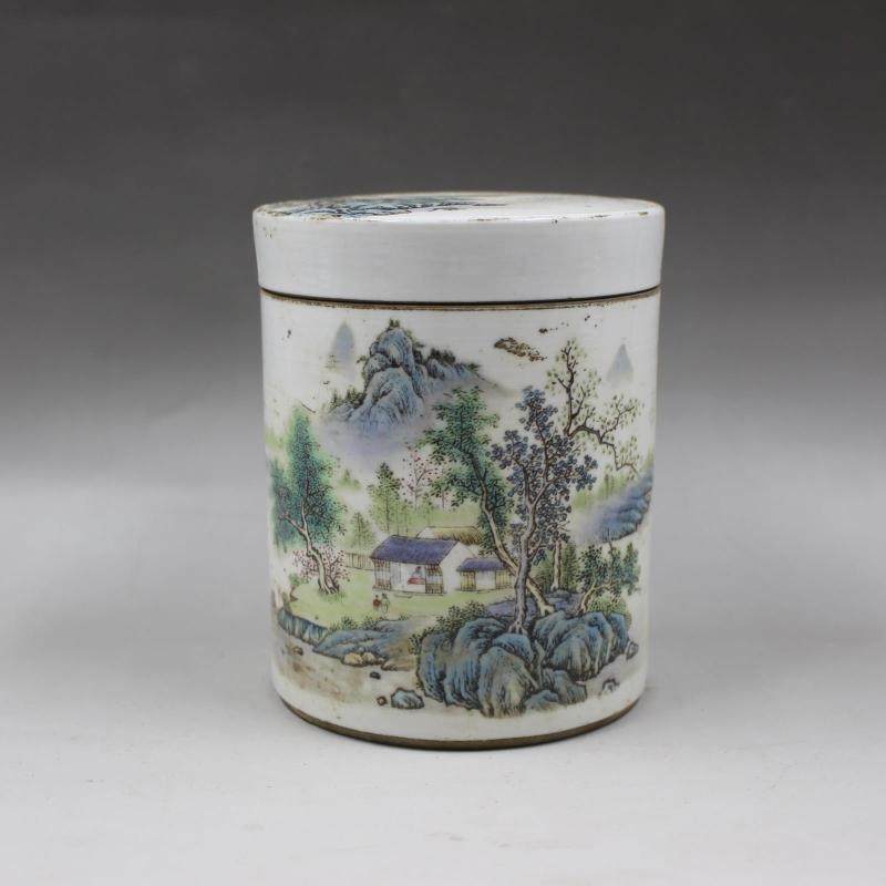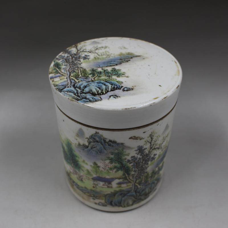 民國江西瓷業公司粉彩山水茶葉罐 仿古老貨瓷器 家居擺件古玩收藏1入