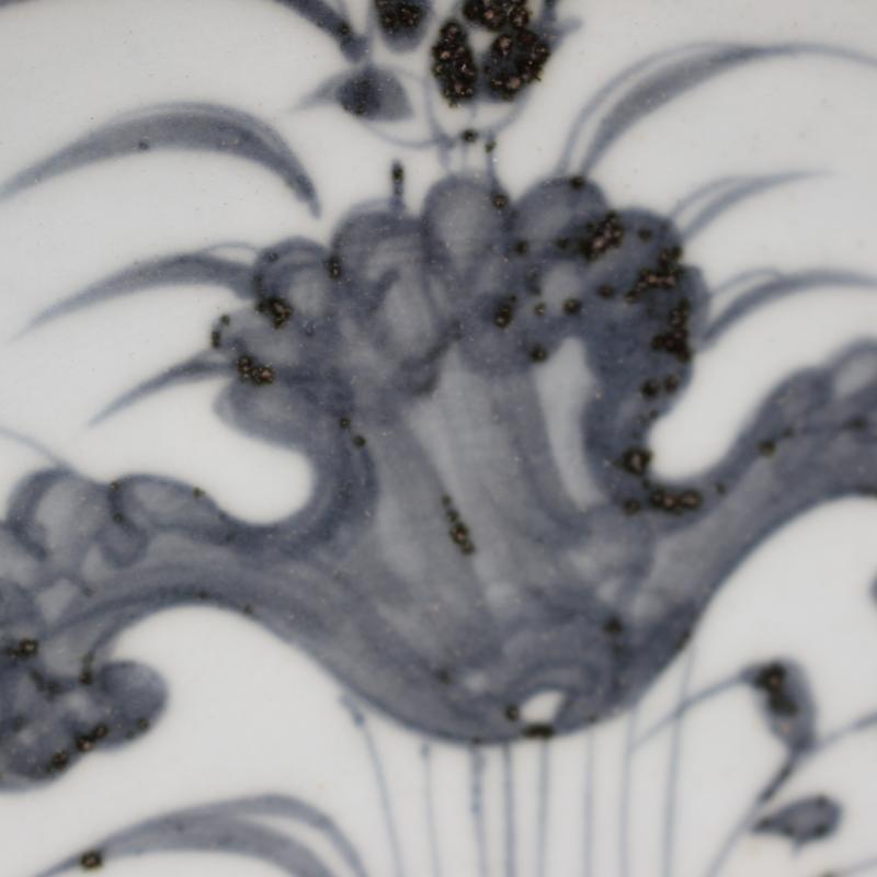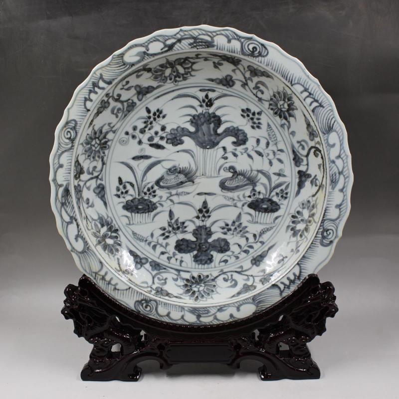 元青花荷花鴛鴦紋葵口大盤 全手繪仿古出土瓷器擺件 古董古玩收藏1入
