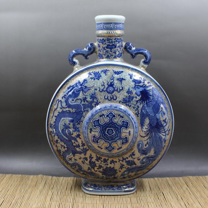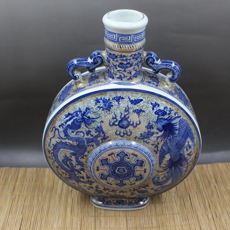 清乾隆年制描本銀青花龍鳳紋扁瓶 全手工精品仿古老貨瓷器擺件1入