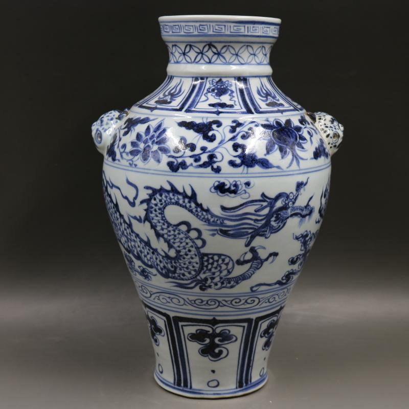 元青花云龍紋獸頭罐全手工仿古出土瓷器老貨古董古玩家居復古擺件1入