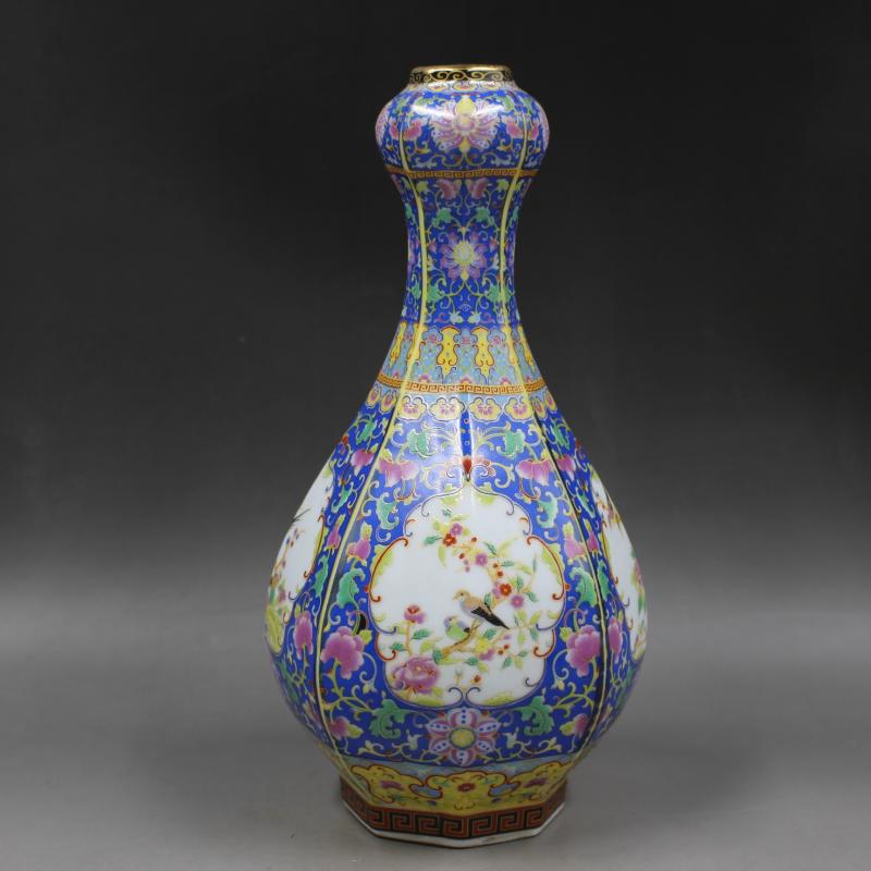 清雍正琺瑯彩花鳥蒜頭瓶仿古瓷器家居復古裝飾擺件古董古玩收藏1入