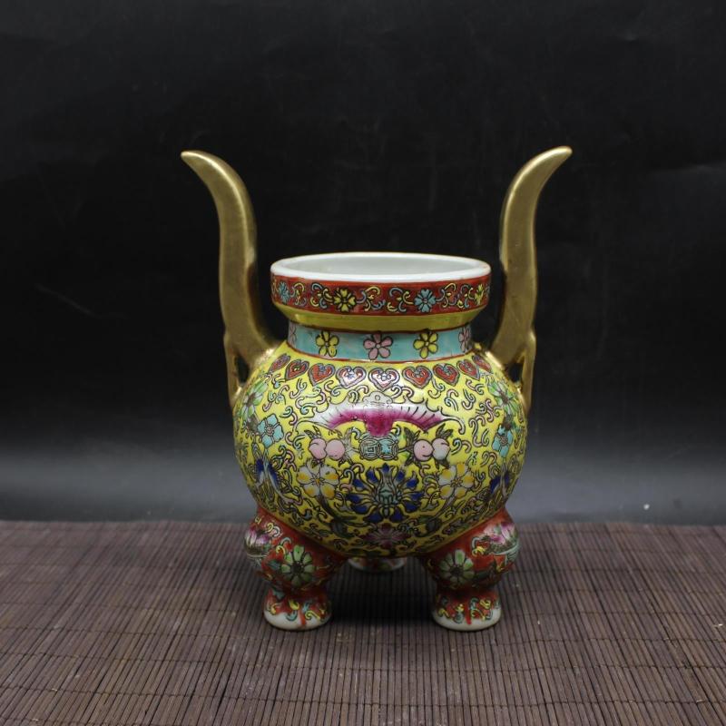 清乾隆粉彩黃地描金壽桃花紋三足香爐 仿古出土瓷器古玩擺件收藏1入