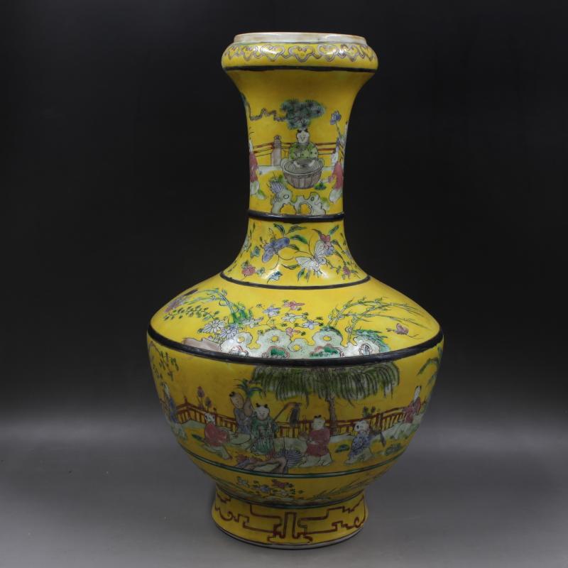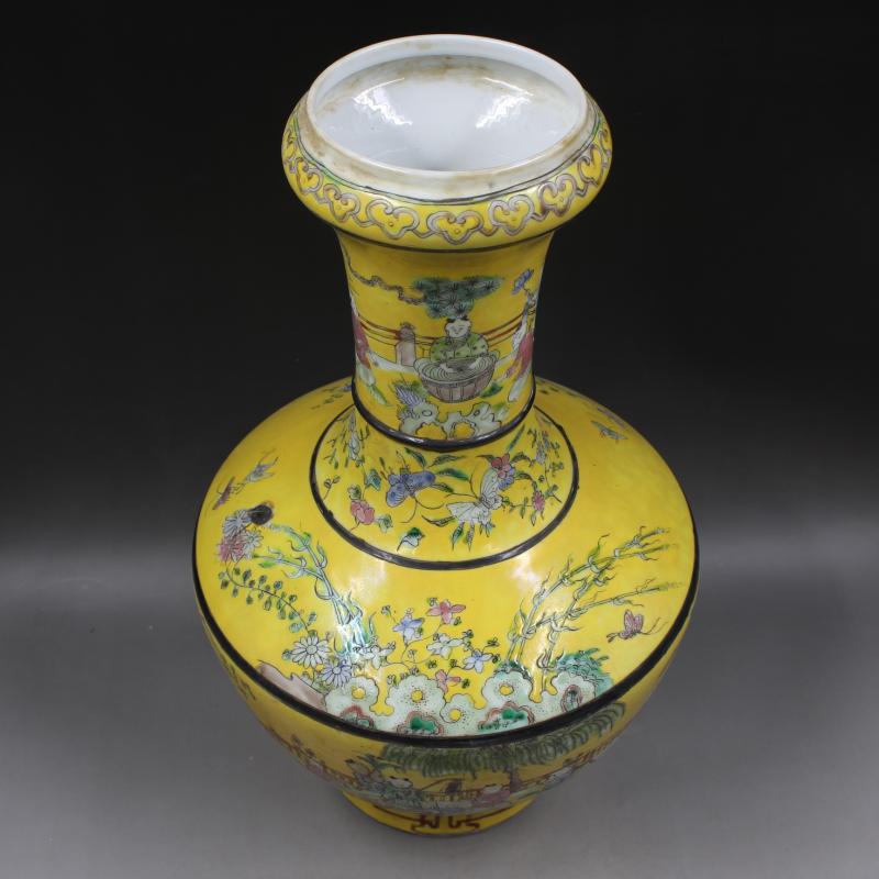 清康熙藍黃地粉彩人物長頸天球瓶 老貨收藏擺件 仿古瓷器古董古玩1入