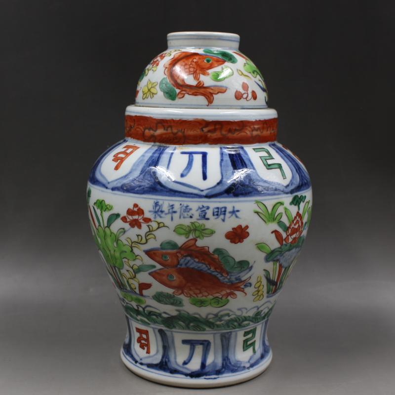 大明宣德年制青花斗彩魚澡紋碗蓋罐手繪仿古瓷器擺件古董古玩收藏1入