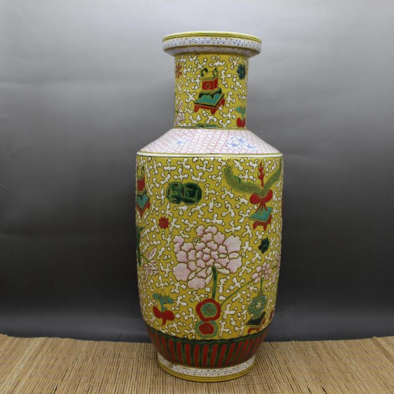 清康熙年制黃地粉彩八寶花紋棒槌瓶 仿古出土瓷器 家居擺件收藏1入