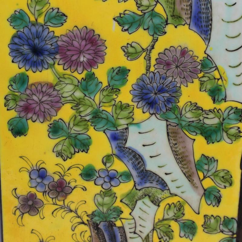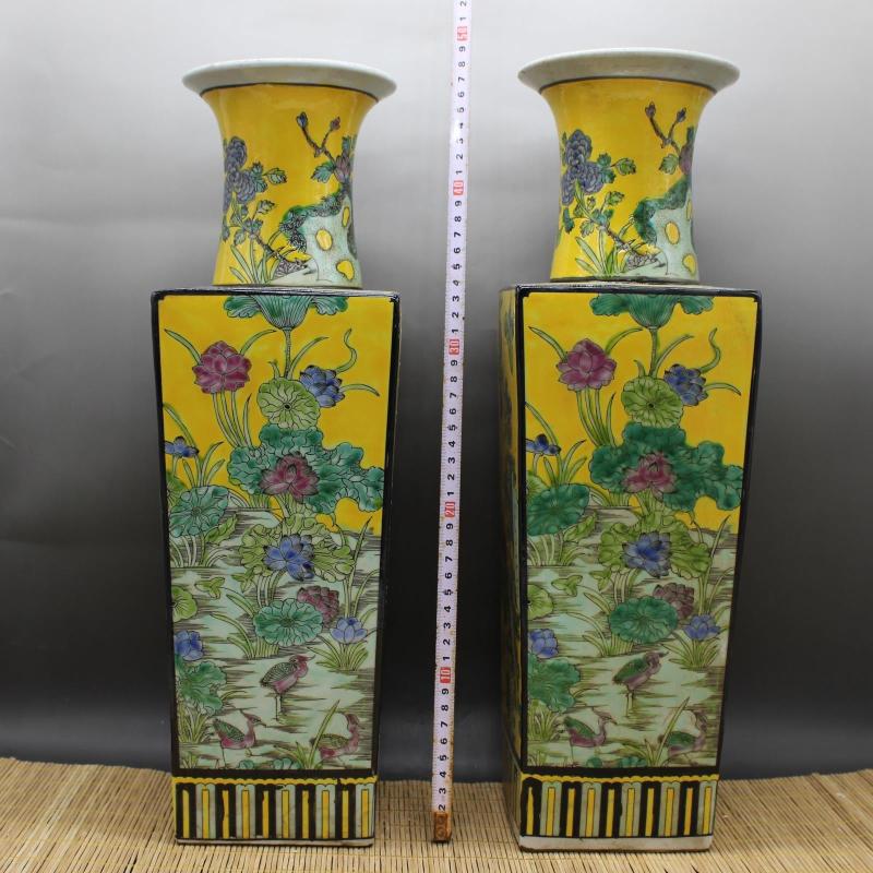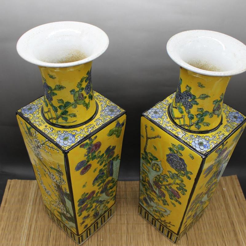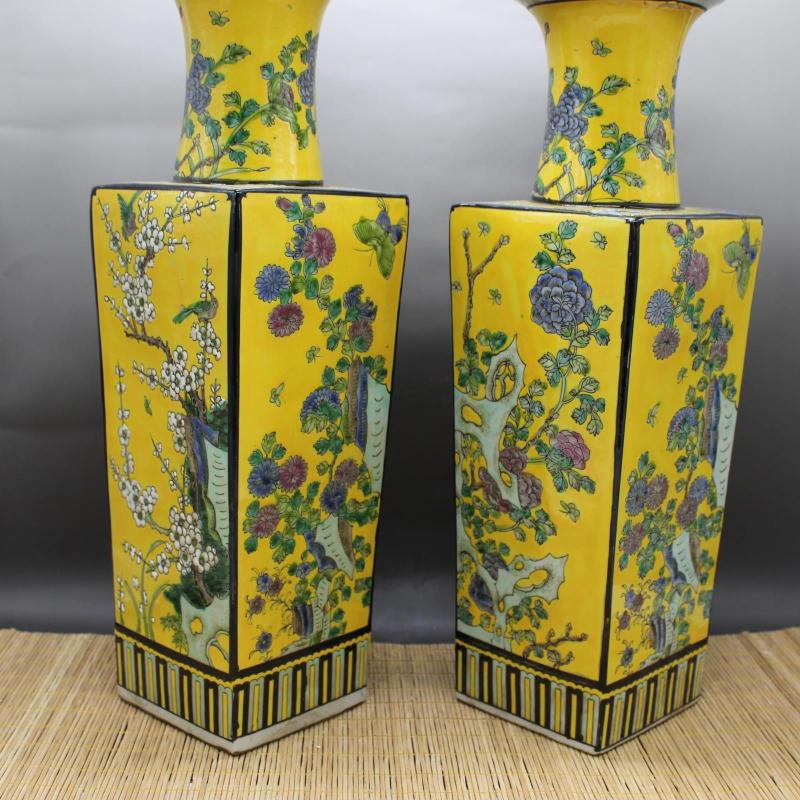 清康熙黃地粉彩四季花鳥天圓地方花瓶 仿古瓷器古董古玩擺件收藏1入